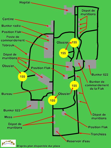 Au sud-ouest du village de Grandcamp-Maisy, les Allemands construisirent en 1942/1943 deux batteries d'artillerie dénommés WN83 et WN84. La WN84, qui fut construite en premier, comprenait 4 canons de 100 d'origine tchèque dans des encuvements et 2 canons de 75 antiaériens (Flak). Par la suite, les encuvements furent remplacés par des casemates pour canons de type H612 (3 seulement furent achevés). La WN84 comprenait également 5 tobrouks de type VF58c et un abri pour deux compagnies de type R622. Le WN84 fut réuni avec la WN83 par un même champ de barbelés et de mine.